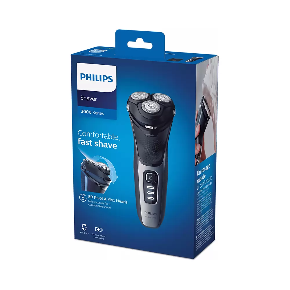 La afeitadora Philips 3000 cuenta con un movimiento pivotante en 5 direcciones que se adapta a todos los ángulos y curvas de la cara y el cuello. Esta afeitadora para la barba corta cada pelo por encima del nivel de la piel para proporcionar un acabado suave y uniforme.