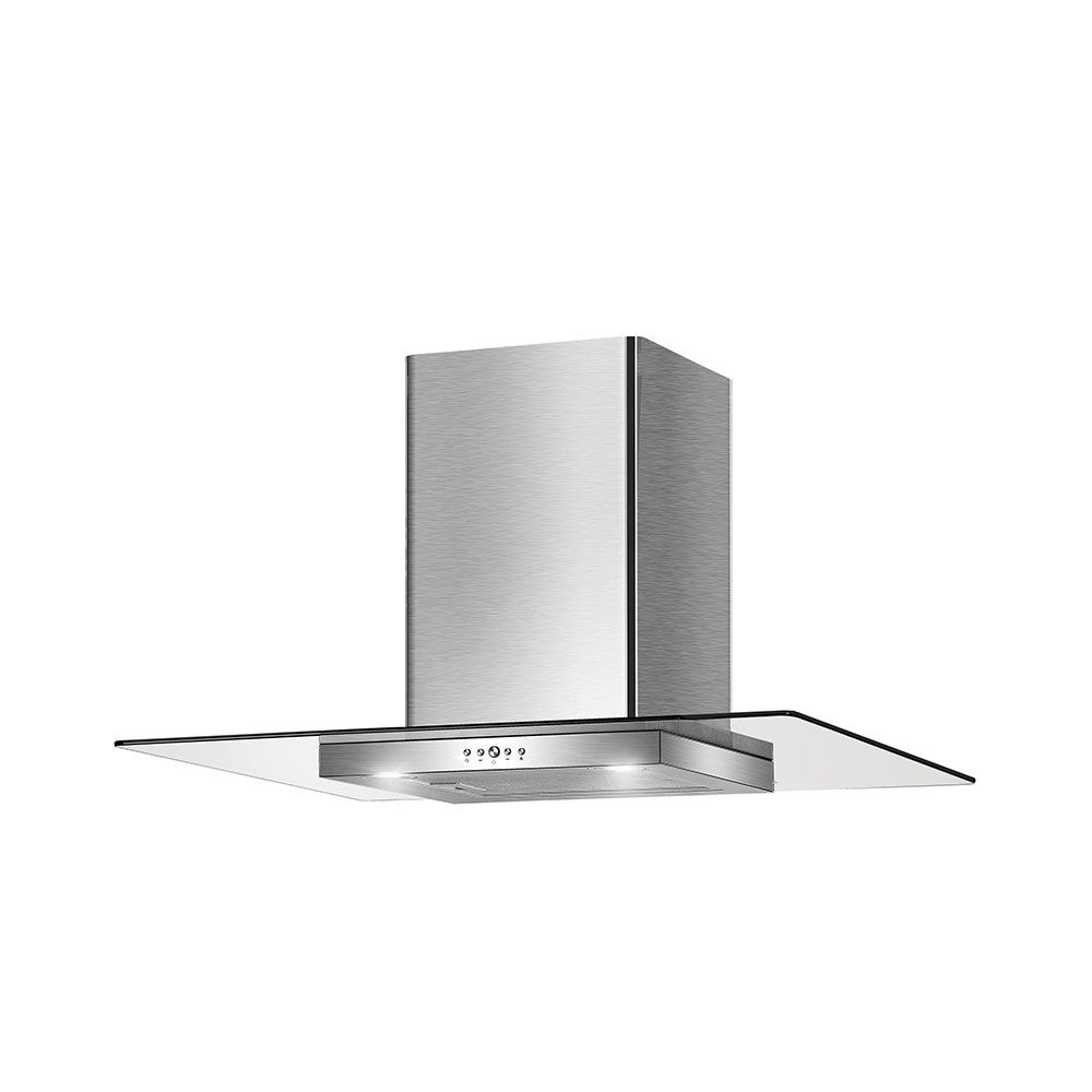 Campana extractora decorativa de pared en acero inoxidable y cristal.