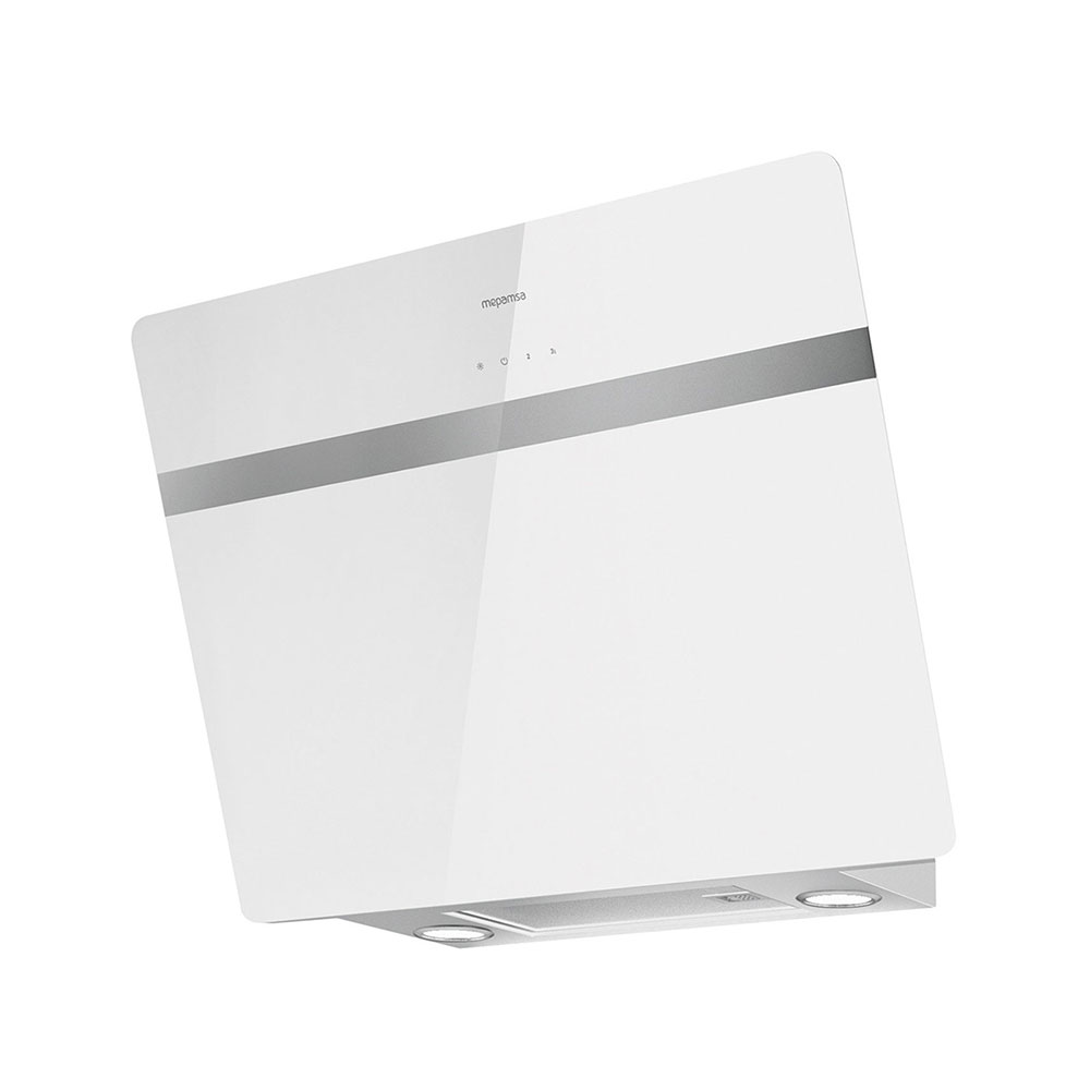 Campana extractora decorativa de pared de elegante diseño en cristal blanco.