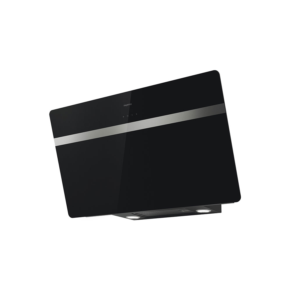 Campana extractora decorativa de pared de elegante diseño en cristal negro.
