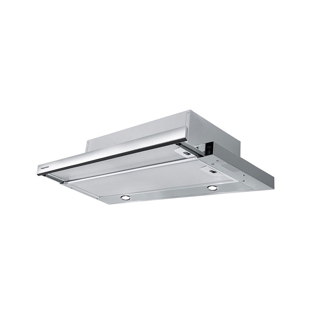 Campana extractora tradicional extraplana telescópica integrable en mueble, acabado en acero inoxidable.