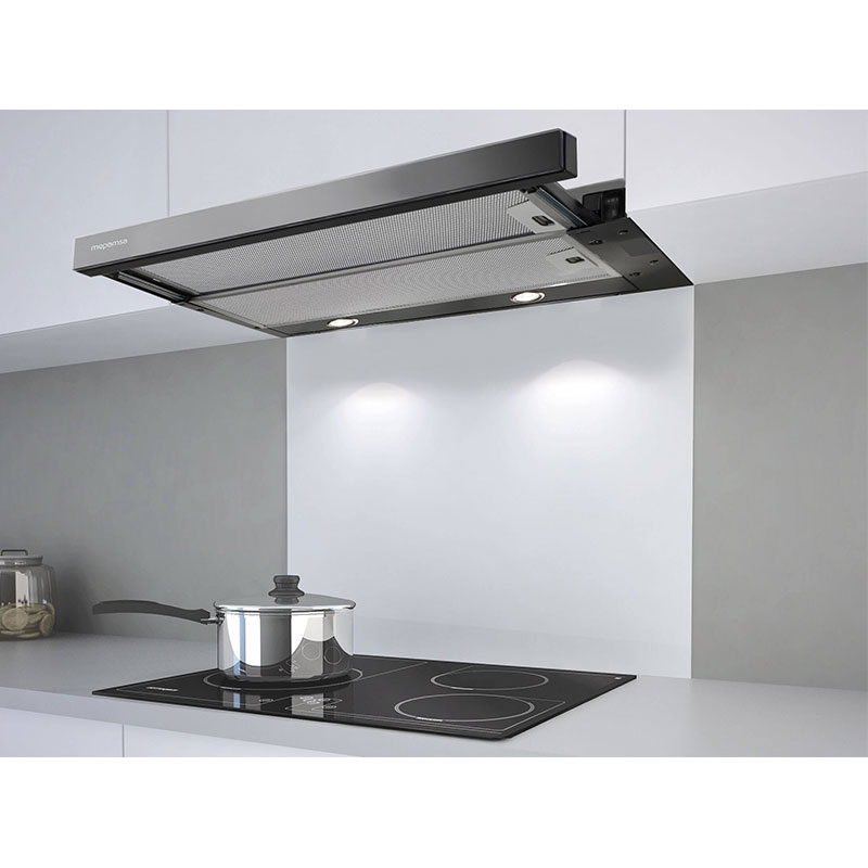 Campana extractora tradicional extraplana telescópica integrable en mueble, acabado en color negro y frontal en cristal negro.