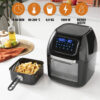 El horno-freidora de aire tiene una gran capacidad de no menos de 10 litros, lo que te permite preparar alimentos para toda la familia y amigos. Presenta una apariencia lujosa con un panel de control moderno y un diseño elegante. El horno tiene una puerta extraíble, lo que facilita su limpieza.