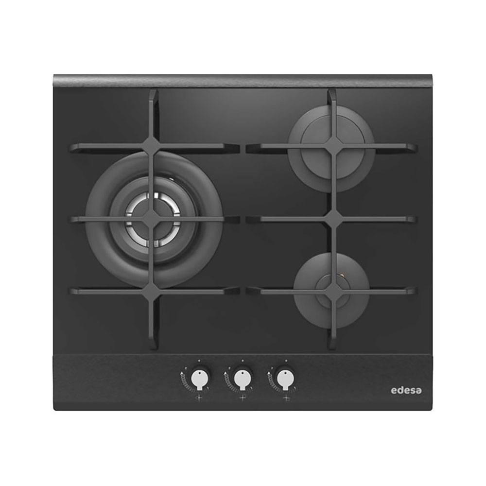 Características Técnicas: Placa De Gas Natural Con 3 Quemadores Con 2 Parrillas De Hierro Fundido Sobre Superficie De Vidrio Templado (Triple Corona, Semi-Rapido Y Auxiliar). Mandos Frontales. Encendido Electronico Integrado En Mando. Sistema De Seguridad De Corte De Gas. Potencia Total Gas: 6,55 Kw. Dimensiones (Ancho X Fondo X Alto) : 590/580 X 522/510 X 112,5/97 M