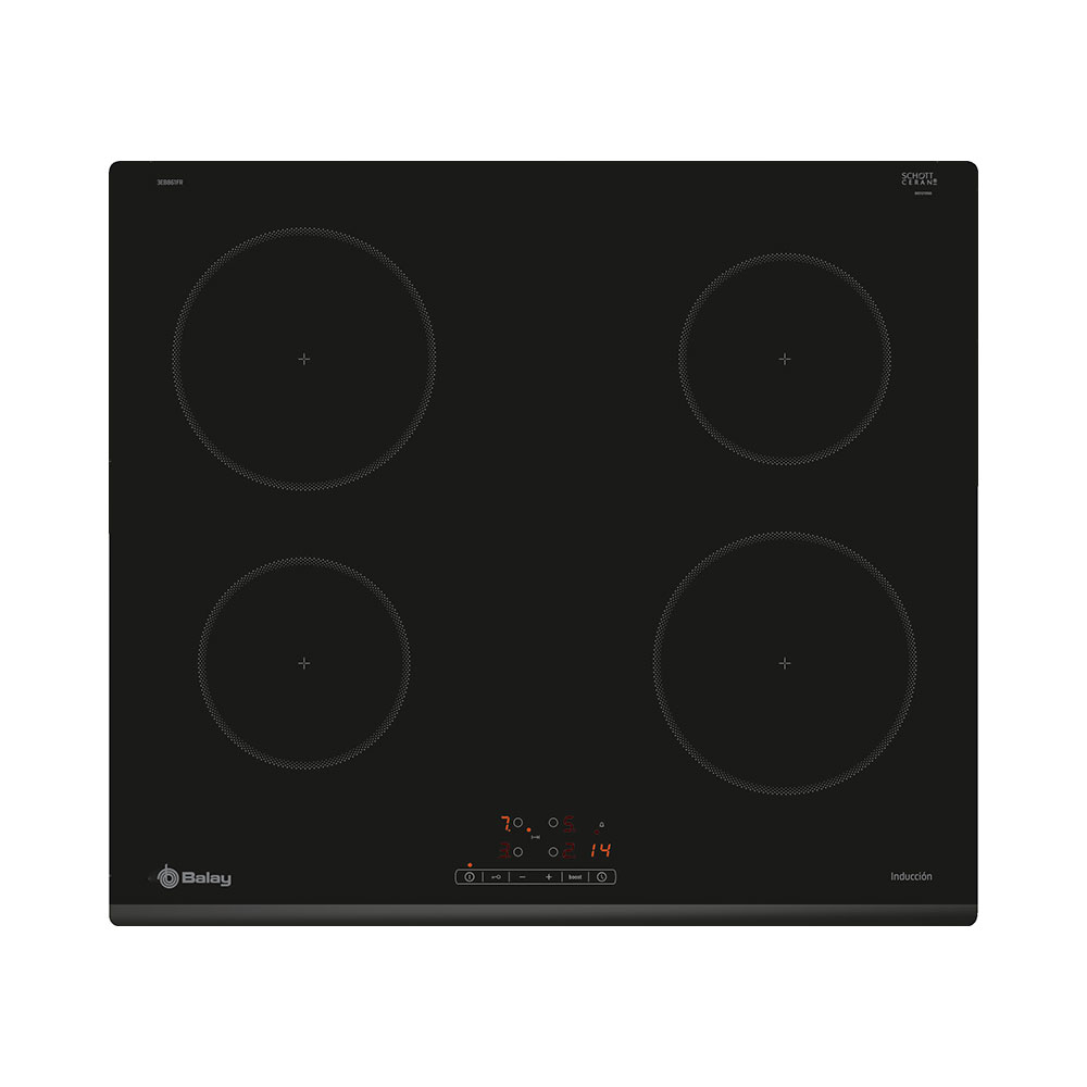 Control táctil de fácil uso con 17 niveles de cocción en cada zona. 4 zonas de inducción con función Sprint® (boost): – 2 zonas de 18 cm. – 2 zonas de 15 cm. Función Comprobar recipiente. Función Memoria. Función Inicio automático. Función de Seguridad para niños con opción de bloqueo permanente o temporal. Autodesconexión antiolvido de la placa. Función Potencia máxima regulable: posibilidad de limitar la potencia total de la placa. Función Silencio: posibilidad de desconectar los avisos sonoros. Indicador de 2 niveles de calor residual para cada zona de cocción (H/h). Sistema de fácil instalación. Potencia total máxima de la placa: 4.6 kw