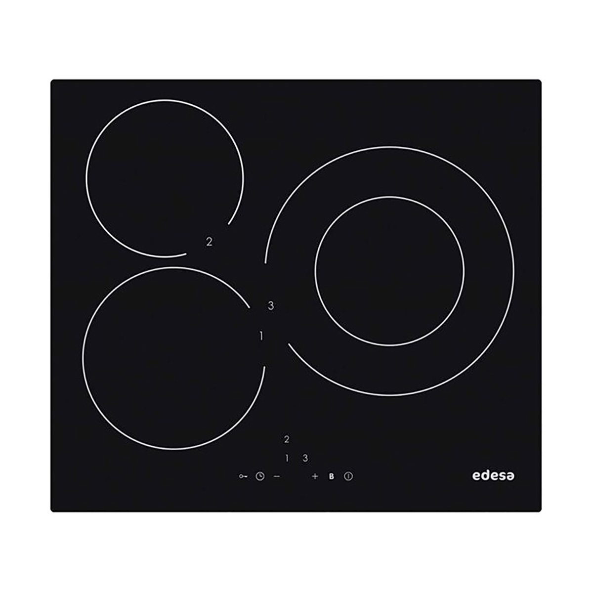 Placa de inducción 3 focos con borde redondeado (30 cm, 22 cm y 18 cm). Panel de control tipo Mono Slider Touch. Selector de potencia centralizado, con 9 niveles Celeris y temporizador. Bloqueo de seguridad e indicador calor residual. Potencia máxima 7,1 kW. Dimensiones (ancho x fondo x alto): 590 x 520 x 60 mm